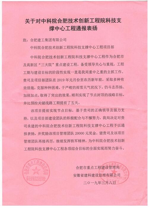 3月8日,由合肥建工六分公司施工管理的中科院合肥創(chuàng)新院科技支撐中心項目,受到建設單位中科院合肥技術創(chuàng)新工程院、合肥市重點局、安徽建科監(jiān)理公司下文表彰及重金獎勵。