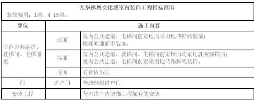 4、范圍:九華佛教文化城室內裝飾工程施工圖紙范圍內的公共部位裝飾。(范圍具體見附件1)
