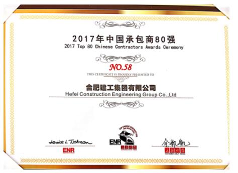 11月29日,由美國《工程新聞紀錄》雜志(英文簡稱ENR)和中國《建筑時報》兩家權威媒體共同主辦的2017年中國承包商80強和工程設計企業60強發布會在蘇州召開。合肥建工喜獲中國承包商80強企業,位列第58名。